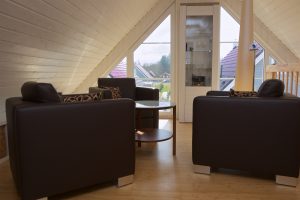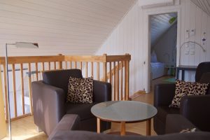 Das Wohnzimmer ist mit Sofa und Sessel eingerichtet, 2 Smart-TVs sorgen ebenso für Abwechslung wie die große Spielesammlung und die Lounge-Ecke in der Galerie. Am Esstisch neben dem Kamin finden bis zu 6 Personen und ein Kleinkind Platz.
